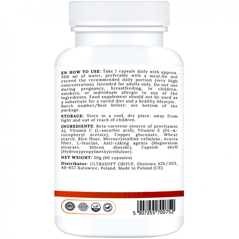 Zalecane spożycie: 1 kapsułka dziennie, najlepiej w trakcie posiłku zawierającego tłuszcze, co zwiększa przyswajalność beta-karotenu oraz witamin rozpuszczalnych w tłuszczach. Nie należy przekraczać zalecanej porcji do spożycia w ciągu dnia.